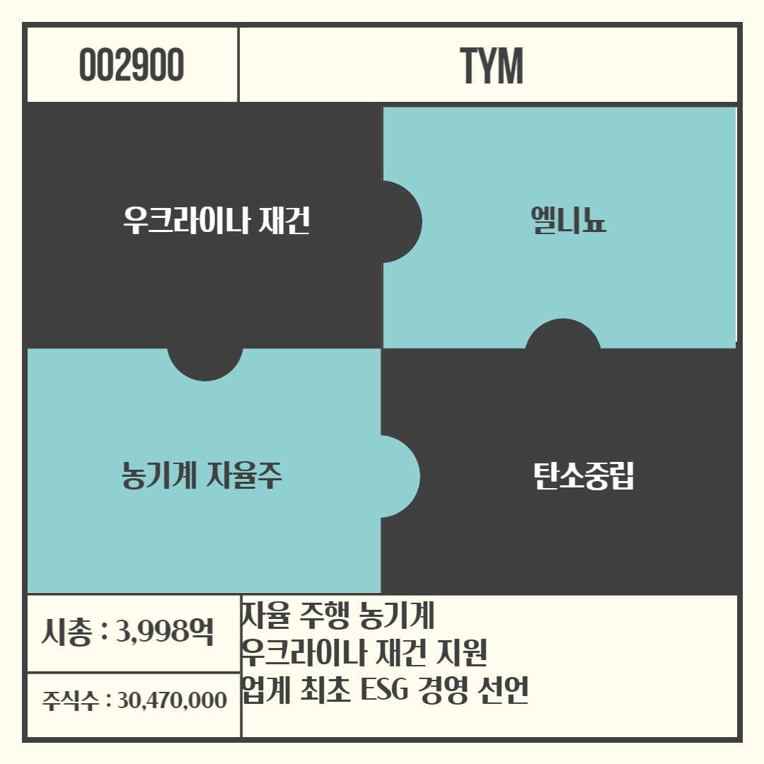 TYM(002900) - 농슬라 , 우크라이나 재건 관련주 , 탄소중립 관련주 , 엘니뇨 관련
